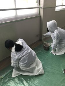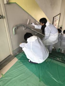 すぐに楽しそうに大胆に、でもしっかり丁寧に校舎の壁を塗っていました。