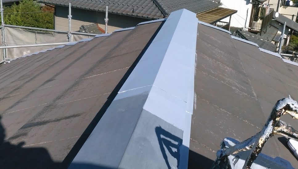 こちらは、屋根の棟部分のサビ止めを塗っている所です。