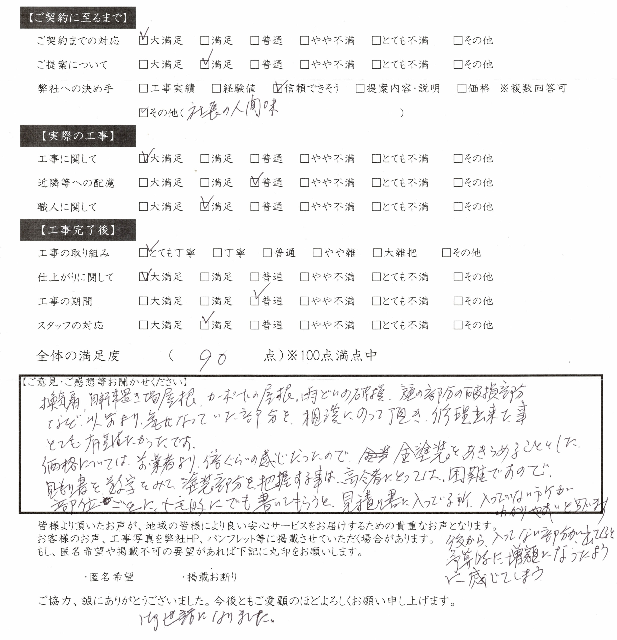換気扇、自転車置き場、屋根、カーポートの屋根、雨どいの破損、壁の部分の破損部分など、以前より気になっていた部分、を相談にのってい頂き、修理できたこ事とても有難かったです。 大垣市 Y様