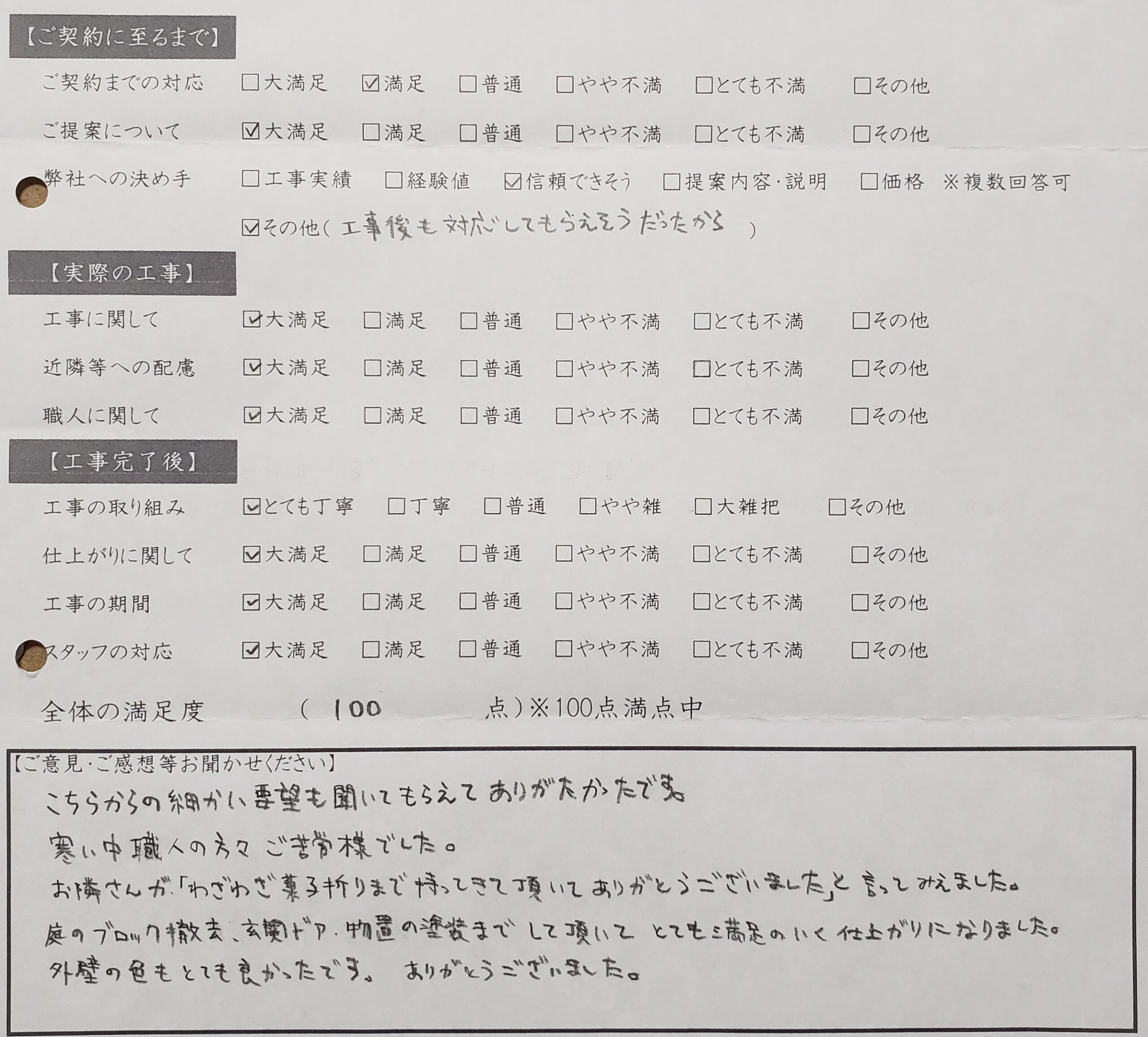 庭のブロック撤去、玄関ドア・物置の塗装までして頂いて、とても満足のいく仕上がりになりました。