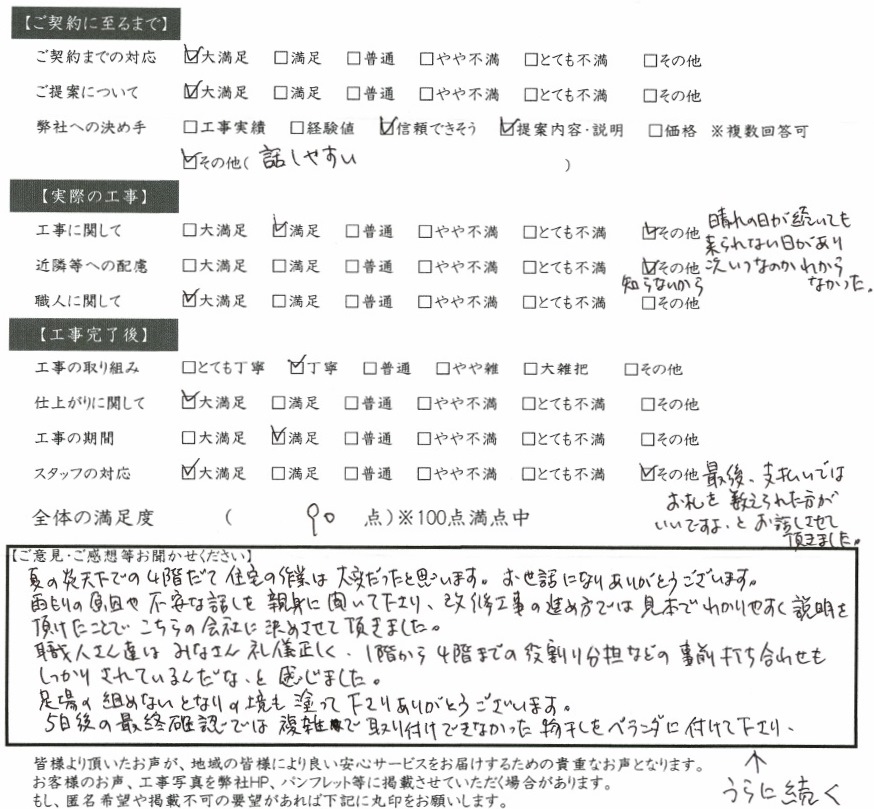 5日後の最終確認では、複雑で取り付けできなかった物干しをベランダに付けて下さり、また、よごれやキズを付けてしまった所をていねいに塗り直して下さりうれしかったです。