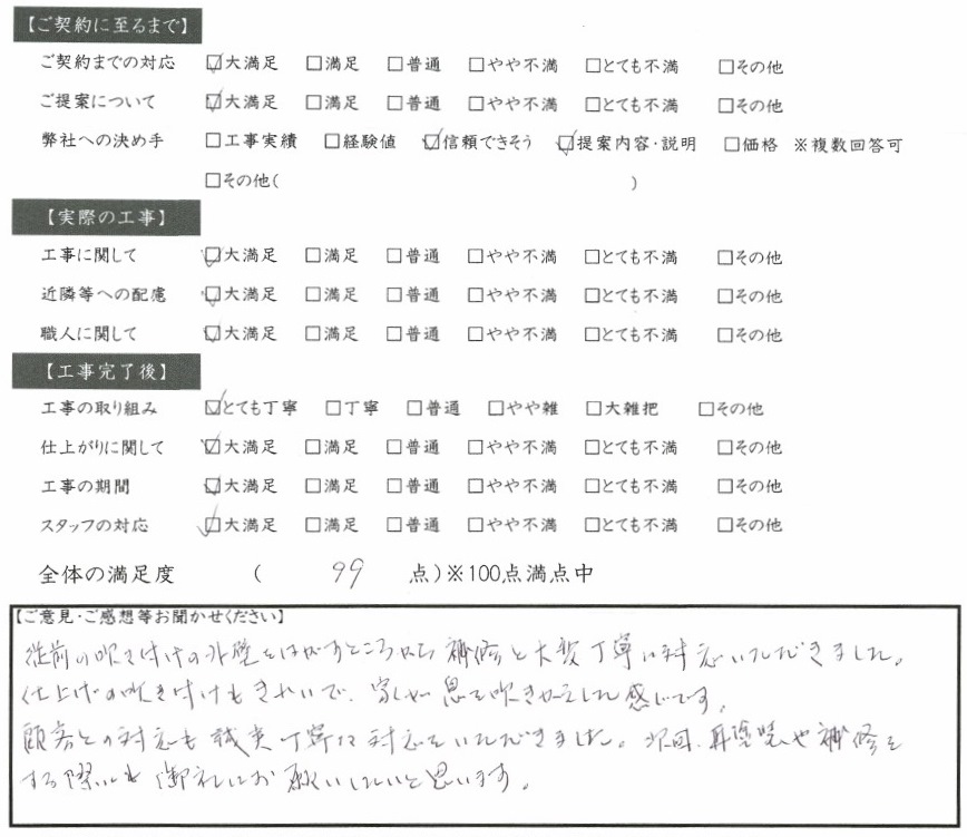 従前の吹き付けの塗装をはがすところから補修と大変丁寧に対応いただきました。