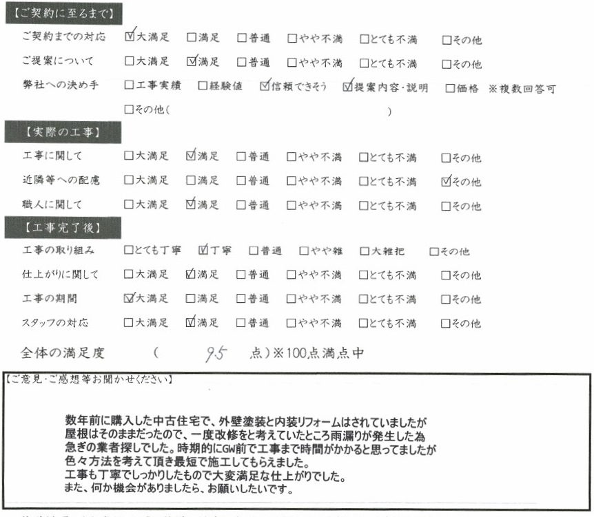 数年前に購入した中古住宅で、外壁塗装と内装リフォームはされていましたが屋根はそのままだったので、一度改修をと考えていたところ雨漏りが発生した為急ぎの業者探しでした。