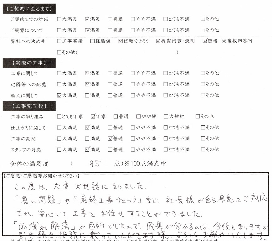 「雨漏れ解消」が目的でしたので、成果が分かるのは今後となりますが、引き続き相談にのっていただきます様、よろしくお願いいたします。