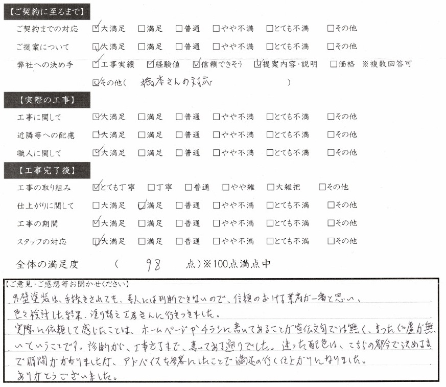 外壁塗装は、手抜きされても、素人には判断できないので、信頼のおける業者が一番と思い、色々検討した結果、塗りかえ工房さんに行きつきました。
