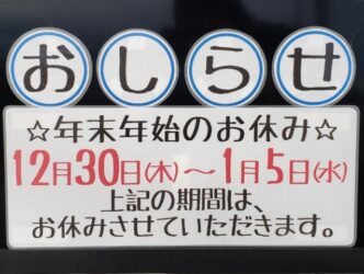 12月30日から1月5日まで、年末年始休暇としてお休みさせていただきます。