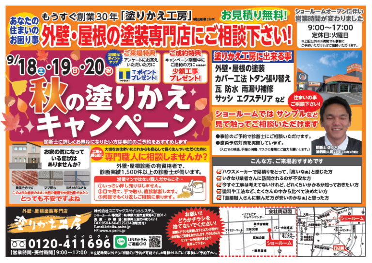令和3年9月今週末の連休は、秋の塗りかえキャンペーン‼